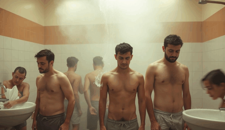 las bancas junto a los lockers e inicias el baño, una vez adentro el ambiente es desinhibido y